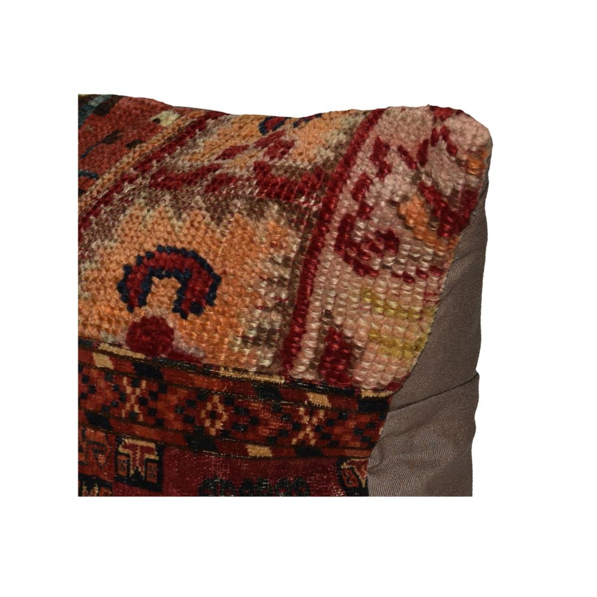 Coussin composé de fragments de tissages kilim vintage et tapis antique d'origines diverses d'Anatolie, Turkménistan, Perse, Kurde, Arménie, Kafkas, reflétant différentes textures, époques, et éthnies. . Cette pièce se distingue par la richesse deses motifs ancrés dans l’histoire, mais aussi par la richesse de ses couleurs(rouge, bleu, bordeaux, vert, marron, blanc et orange).