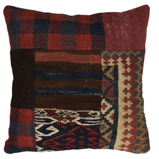 Coussin composé de fragments de tissages kilim vintage et tapis antique d'origines diverses d'Anatolie, Turkménistan, Perse, Kurde, Arménie, Kafkas, reflétant différentes textures, époques, et éthnies. La spécificité de ce coussin se trouve dans lamanière dont il est tissé. Cela ressemble à une forme de puzzle dont chaquecarré ou rectangle est tissé avec des motifs et des couleurs différentes. Lescouleurs sont très variées (rouge, bordeaux, marron , bleu marine, beige, etorange).