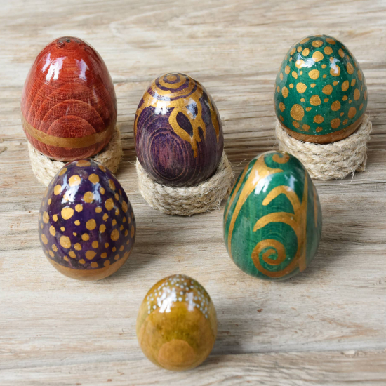 Les différentes couleurs sont le rouge pourpre, le vert emeraude, le ambré, et la couleur naturelle du bois. Nous offrons un choix de motifs dessinés à la main sur les oeufs, dorés ou argentés. Toutes les pièces sont ensuite laquées afin de préserver et insister sur l’aspect naturel du bois.